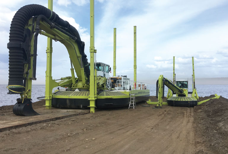 Attachments include horizontal cutterheads, backhoe buckets, an effective closed environmental bucket with hydraulic opening and closing, rakes and rock breakers, to name a few. Capabilities include aquatic weed cutting and harvesting (widely used in Africa), excavating and dredging, trash and debris collection, laying pipeline and underwater cables, marina maintenance, beach refurbishment, contaminated sediment handling and removal, and preventive ice breaking on rivers before the spring run.