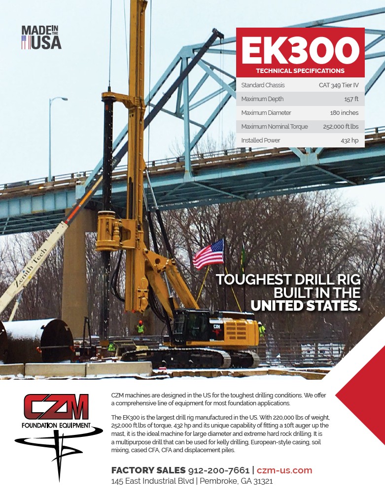 The EK300 is the largest drill rig manufactured in the US. With 220,000 lbs of weight,