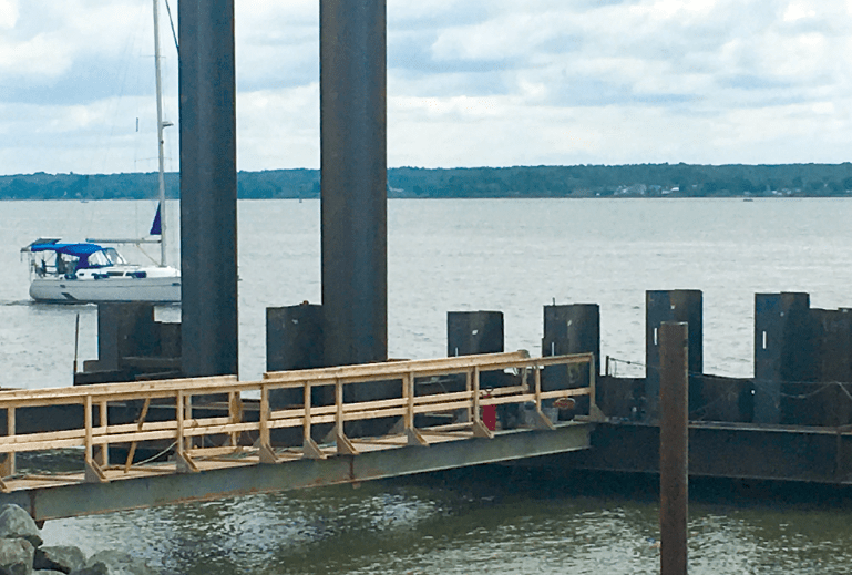 The construction of this project began in early June 2017, with the contractor preparing the site by demolishing the aging Pier 9 and excavating as needed. This phase was immediately followed by the installation of the stone embankment along the river.